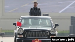Președintele Chinei, Xi Jinping, îmbrăcat într-un costum tradițional chinezesc gri-închis, a salutat trupele dintr-o limuzină decapotabilă.