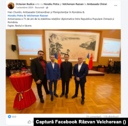 „Han Chunlin, Ambasador Extraordinar și Plenipotențiar în România & Horatiu Potra & Velcherean Razvan. Aniversarea a 75 de ani de la stabilirea relațiilor diplomatice între Republica Populară Chineză și România. Fapte. Restul e tăcere”, a scris Liviu Octavian Budică la postarea de pe pagina sa de Facebook.