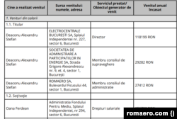 În declarația de interese menționează calitatea de președinte la PSD București. A fost candidat PSD la alegerile parlamentare din 2020. În 2024 nu a declarat venituri de la Romaero, deși a fost membru CA. Soția sa a declarat 113.000 lei venituri din funcția de consilier la Ministerul Finațelor. - Alexandru Ștefan Deaconu – membru al CA. Fost director la Institutul de Studii Liberale, cu experiență la Electrocentrale București – direcția de control și securitate.