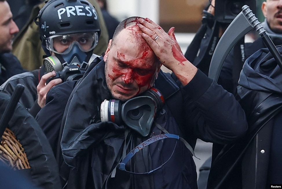 Un protestatar lovește cu o bucată de gard metalic în fațada Parlamentului European.