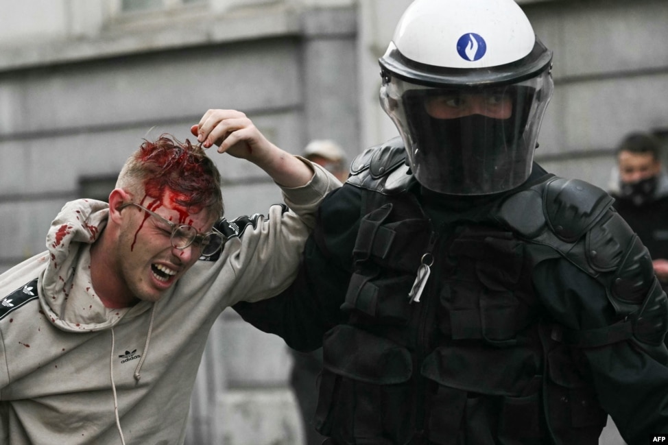 Un ofițer de poliție ține un protestatar rănit.